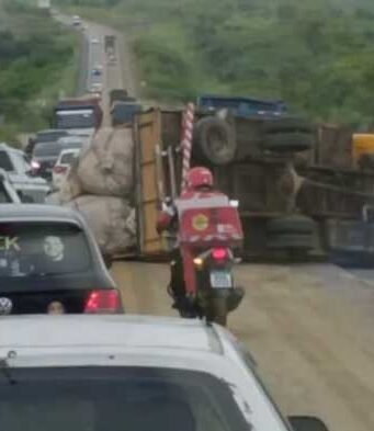 Caminhão tomba, deixa motorista ferido e interdita parcialmente BR-230, em Campina Grande
